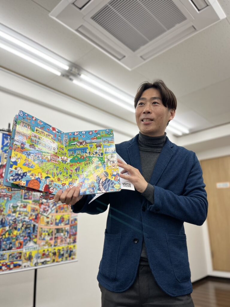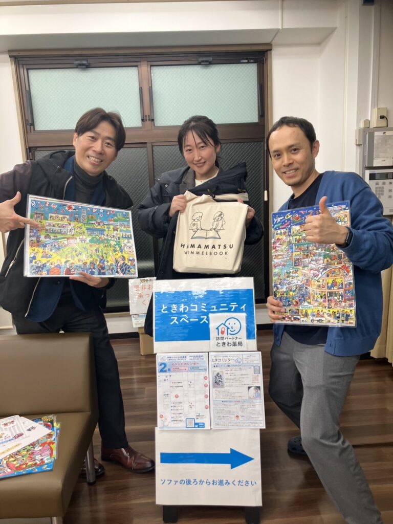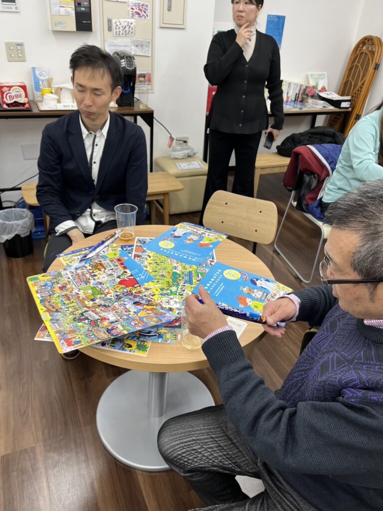 月に一回、医療・介護・福祉に関わる方が集まるさしいれ道場(会場:ときわコミュニティスペース)で、浜松ウィンメルブックの介護・福祉現場での活用方法と題し、交流会を行いました。各ページの描写の説明と共通キャラの早探し対決から始めましたが、これだけでアイスブレイクはバッチリでした。